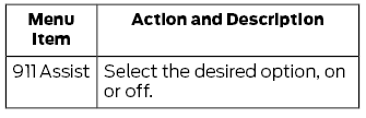 Note: If any user switches 911 Assist to on or off, that setting applies for all paired phones. If 911 Assist is switched off, either a voice message plays or a display message or an icon comes on when your vehicle is started and after a previously paired phone connects.