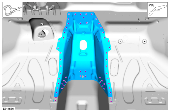 NOTE: Factory welds may be substituted with resistance or metal inert gas (MIG) plug welds. Resistance welds may not be placed directly over original location. They must be placed adjacent to original location and match factory welds in quantity. Metal inert gas (MIG) plug welds must equal factory welds in both location and quantity.